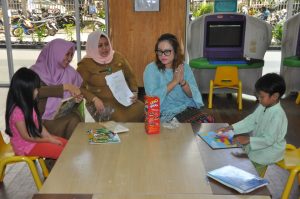 Untuk mewujudkan fungsi rekreasi tersebut, Pustakawan Dinas Perpustakaan dan Kearsipan Provinsi Riau Delviana Fransiska, S.Sos., M.I.Kom yang baru sebulan ini diaktifkan kembali Fungsional Pustakawannya setelah berhenti sementara dikarenakan menjalani beasiswa pendidikan tugas belajar dari Provinsi Riau bertepatan dengan Sempena Hari Kartini yang diselenggarakan oleh Dipersip Provinsi Riau menghibahkan beberapa permainan edukatif ke Perpustakaan Soeman Hs Provinsi Riau yang diterima langsung oleh Kabid Pelayanan Perpustakaan, Dokumentasi dan Informasi Ibu Odor Juliana Sidabutar, S.Pi yang didampingi Kasi pelayanan Perpustakaan Ibu Herawaty, S.Sos dan Pustakawan Lainnya di ruang Layanan anak-anak Perpustakaan Soeman Hs. Untuk mengajak dan mengenalkan Perpustakaan ke anak-anak tidak mudah perlu cara khusus untuk membuat anak-anak tertarik datang ke Perpustakaan’ ujar devi sapaan akrabnya. Salah satunya melalui sebuah permainan, anak-anak jika mendengar kata-kata permainan pasti senang, jadi kita buat anak-anak senang dulu setelah itu baru kita kenalkan kalau di Perpustakaan ada Permainan edukatif, trik Devi dalam memperkenalkan Perpustakaan kepada anak-anak. Devi yang jebolan magister Ilmu Perpustakaan Universitas padjadjaran Bandung ini langsung mempraktekkan permainan edukatif kepada pemustaka anak-anak yang datang berkunjung. Ternyata Pemustaka anak-anak ini langsung menyukainya. Fasilitas di layanan anak-anak juga ada permainan edukatif lainnya seperti computer game, pengenalan Globe dengan pen digital, dan boneka tangan untuk mendongeng tapi koleksi permainan edukatif seperti puzzle berbahan kayu, Uno, congklak, dan huruf abjad berbahan kayu ini koleksinya memang belum ada, ujar Kabid Pelayanan Perpustakaan. Permainan edukatif ini nantinya akan kita layankan juga di mobil keliling setiap car free day (CFD) hari Minggu pagi, agar orangtua mengajak anaknya untuk bermain bersama distan mobil keliling kita, ‘harap ibu Odor.